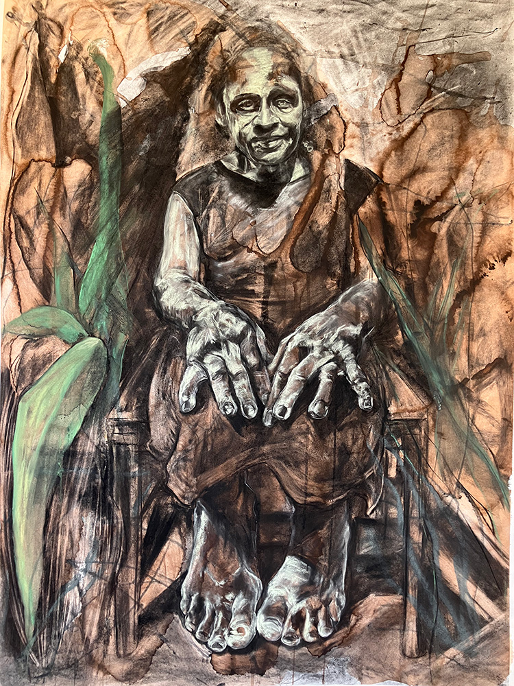 I bow to my mother’s feet. (2024) Ink, charcoal, and pastel on paper. 34 x 50 inches.